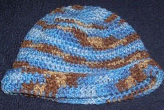 Hand crocheted newborn, rolled brim hat. 60% acrylic, 40% polyamide. Size: 13". Color: Blue baby camo. Order item: BH4. Price: $6.00. (4 available) |