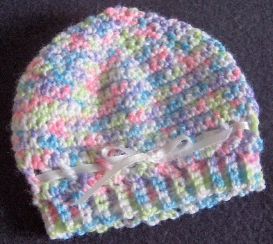 Hand crocheted newborn baby hat. 100% acrylic. Very soft. Size: 12". Color: multiple pastels with white ribbon. Order item: BH3. Price: $6.00. |