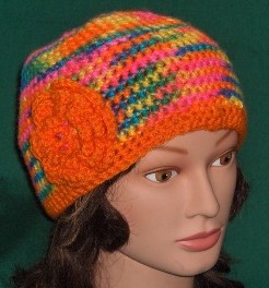 Hand crocheted brightly colored head hugging hat. This hat is accented with a bright orange rose to match the border trim. The hat and flower are 100% acrylic. Size: 24"-26". Order item: HK47. Price $12.00. |