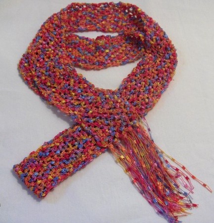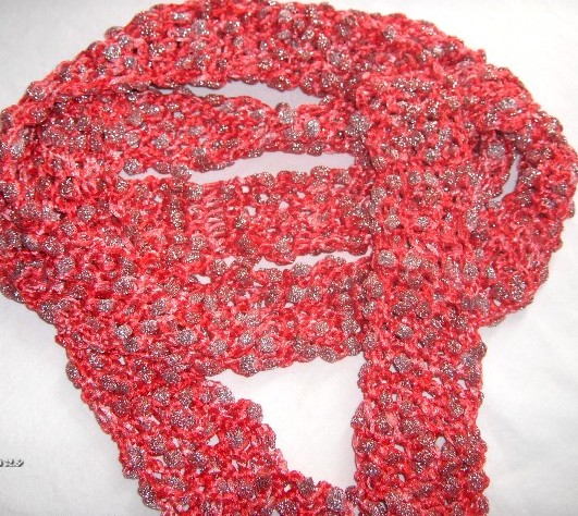 Hand crocheted scarf in orange and shades of pink with silver glitter puffs. This scarf has a silky feel. It is 1-1/2" wide by 74" long. It's 100% polyester. Price: $33.00. |