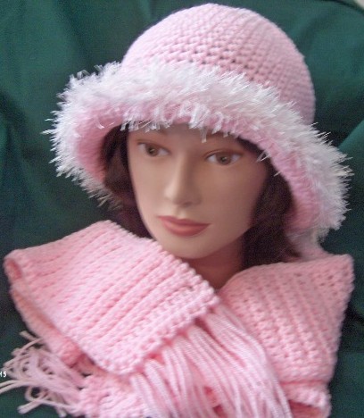 Hand crocheted beautiful, baby pink hat and matching scarf. The scarf is 74" long by 4-1/2" wide. The fringe is 4-1/2" long. Hat size: 24" around. The hat features a rolled brim with fun fur trim. Hat and scarf are 100% acrylic. Trim is 100% nylon.. Order item: HK131. Price: $25.00. |