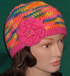 Hand crocheted brightly colored head hugging hat. This hat is accented with a bright pink rose to match the border trim. Size: 23"-25". Order item: HK48. Price: $15.00. |