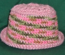 Hand crocheted pink and green variegated child's hat. Brim may be worn up or down. The top has a beautiful open weave pattern. This hat is 100% acrylic. Size: 22". Order item: HK112. Price: $10.00. |