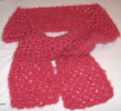 Hand crocheted pink mohair scarf. This scarf is very lightweight and soft. It is 76.5% mohair, 17.5% wool, and 6$ nylon. It measures 5" wide by 69" long. Order S40. Price: $24.00. |