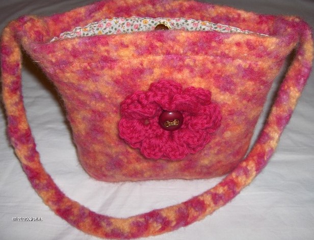 Hand crocheted wool felted purse. This pretty little purse is fully lined and has 3 pockets inside, one for your cell phone, one for sunglasses, and one closes all the way across with velcro. The top of the purse closes with a gold magnetic snap. This purse is accented with a hand crocheted flower with a button in the center. This purse is 8" high by 8" wide and the handle is 28" long. Order item # CPBT17. Price: $18.00. |