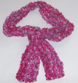 Hand crocheted pink and silver glitter scarf. This fun scarf is very soft and silky. It is 2-1/2" wide and 54" long. It is 100% polyester. Order item: S30. Price: $33.00. |