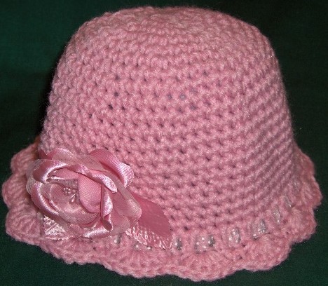 Hand crocheted pink child's hat with matching pink flower pin. This hat is trimmed with a pink ribbon with small white dots. It has a pretty shell edge. Size: 23". Order item: HK108. Price: $10.00. |