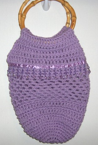 Hand crocheted light lavender hobo. This bas has bamboo handles and is trimmed with ribbon and dangling beads. It is 9" wide by 12" high. This yarn is 100% acrylic. Order item #CPBT26. Price: $18.00. |