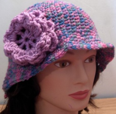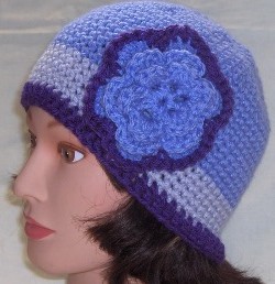 Hand crocheted variegated pink/purple/blue cloche accented with a hand crocheted orchid color flower. The hat is 100% wool and the flower is 100% acrylic. Size: 25" around. Order item: HK68. Price:$12.00. |