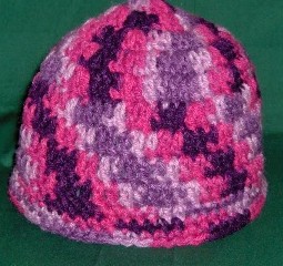 Hand crocheted child's head hugging skull cap. This warm pink and purple hat is 100% acrylic. Size: 24" so that it fits over thick hair.. Order item: HK90. Price: $10.00. |
