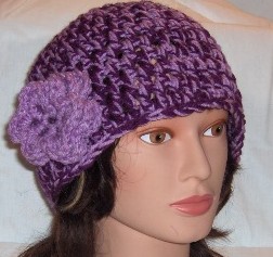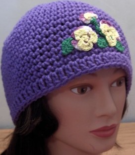 Hand crocheted lavender head-hugging hat accented with 3 hand crocheted pansies. The hat is 100% acrylic and the flowers are 100% cotton. Size: 24" around. Order item: HK76. Price $12.00. |
