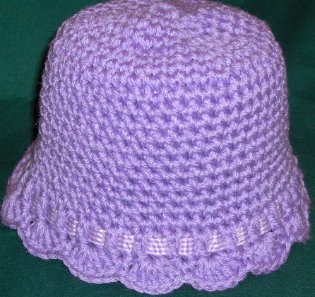 Hand crocheted light purple toddler hat. This hat is trimmed with a purple and white ribbon and pretty shell edging. This hat is 100% acrylic. Size: 20". Order item: HK104. Price: $10.00. |