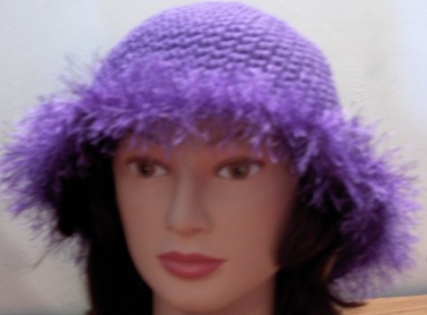 Hand crocheted lavender hat with fun fur trim around the brim. This hat and trim are 100% acrylic. Size: 26" around. Order item: HK72. Price: $12.00. |