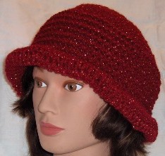 Hand crocheted deep red rolled brim hat. This hat also has the metallic gold thread in the yarn. It is 97.5% acrylic and 2.5% metallic. Size:27". Order item: HK109. Price $14.00 |