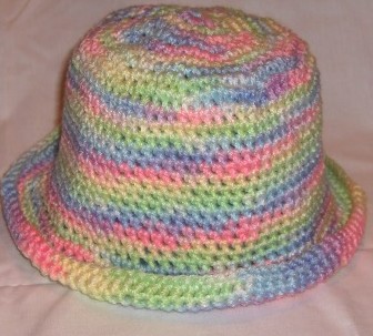 Hand crocheted child's rolled brim hat. Beautiful pastel colors and versatile brim make this hat match any wardrobe. This hat is 100% acrylic. Size: 21". Order item: HK119. Price: $10.00. |