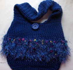 Hand crocheted royal blue hobo with fun furry middle. This bag is 10" wide by 10" high and the handle is 24" long. There is a loop and big button closure. Order item #CPBT28. Price: $18.00. |