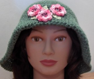 Hand crocheted sage green cloche with 3 different colored hand crocheted flowers. The hat is 100% acrylic and the flowers are 100% cotton. Size: 23" around. Order item: HK71 Price: $12.00. |