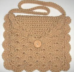 Hand crocheted tan purse with scalloped edge. This bag has a tan wood button and loop closure on the triangle flap. This bag is 8" wide by 7-1/2" high not including the scalloped edge. It is 100% acrylic. Order item # CPBT23. Price: $10.00. |