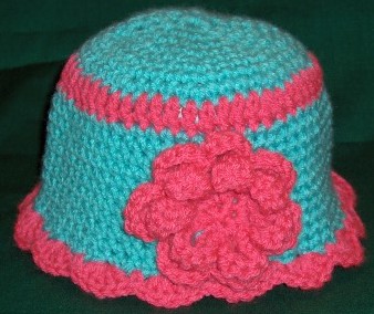 Hand crocheted turquoise and pink toddler hat. This hat is accented with a deep pink rose and shell edging. Hat and flower are both 100% acrylic. Size: 21". Order item: HK103. Price: $10.00. |