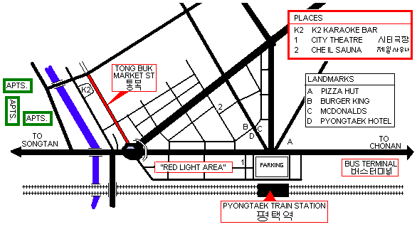 | Karaoke gay bar located in the Tong-Buk Market area of Pyongtaek. At the train station, go through the parking lot, and make a left onto the main street of Pyongtaek. Walk down about 3-4 blocks until you pass under a pedestrian foot bridge. In front of you is a large circular intersection of several roads. One road is actually the Tong-Buk Market, with a arched sign over the entrance. Pass through this intersection, and on your right side, take the second little allet (there are many parked cars on this alley, and it is quite dark!). You will know the alley by the "LESPO" store on the corner (look at overhead awning sign). Across the street from this alley is a large 4 lane bridge over the railroad tracks. Continue down this alley about 2 blocks, and the small bar saying "K-2" will be on your right. The Karaoke bar is in the basement. See map for easier instructions. Friday and Saturday nights are busiest. | ||||||||||||||||||||||||