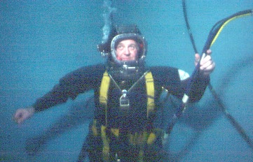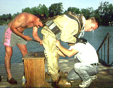 keep the helmet on the diver's shoulders in the water. Here Gary Smith (left)