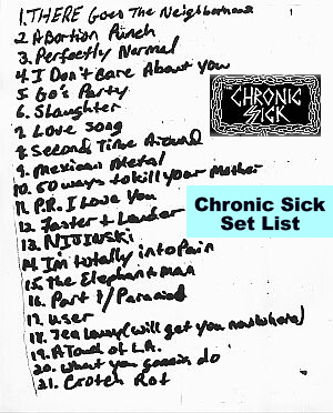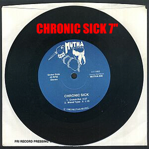 | Here's a page spotlighting one of NJ's earliest Punk groups THE CHRONIC SICK. Formed in 1981, they had two releases on Mutha Records : "Cutest Band In Hardcore" 12" (Mutha 002), and a self-titled 7" EP (Mutha 008) between 1982 - 83'. Many thanks to bassist Arnie Barrs for updates here and othe Mutha pages. |