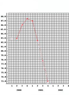 The second part of the statement is equally puzzling. The year-on-year growth is given as a positive 0.5 percent. The amount given as GDP for the second quarter of 2000 is given by the statistics department as RM84.7 billion. The GDP for the second quarter of 2001 is reported to be RM82.6 billion, a decline of RM2.1 billion year-on-year (See pts A and B on Fig 1. below).