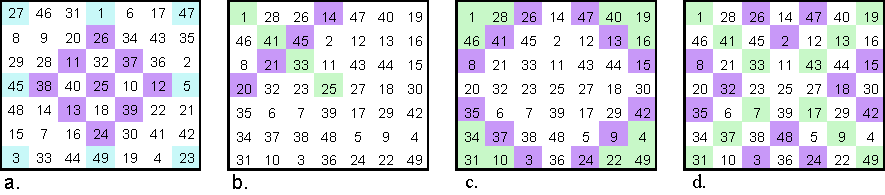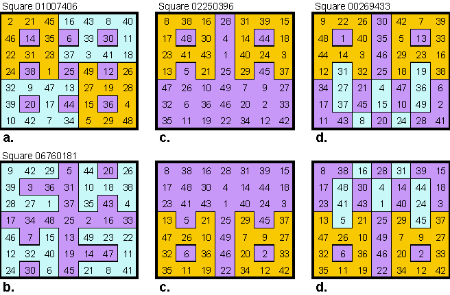 Squares b., c., and d. are 1 of 11 magic squares of order 7 with following features