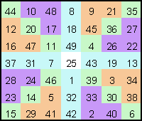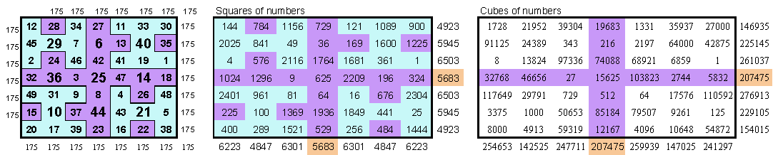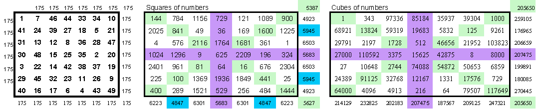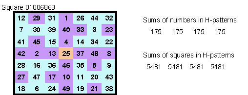 These 4 types of ultra letter squares are all pandiagonal center symmetric (associated) magic a. the sum of the 10 numbers in each letter A sum to 250. The squares of these numbers sum to 8362. There are 11 order-7 magic squares with these features. b. the sum of the 7 numbers in each letter C and H sum to 175. The squares of these numbers sum to 5721. There is only 1 magic square with these features? Squares c. and d. are shown twice because the patterns overlap. c. the sum of the 10 numbers in each letter A sum to 250. The squares of these numbers sum to 7622. There are 5 magic squares with these features. d. the sum of the 10 numbers in each letter A and W sum to 250. There are 60 magic squares with these features. |