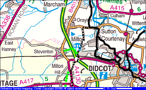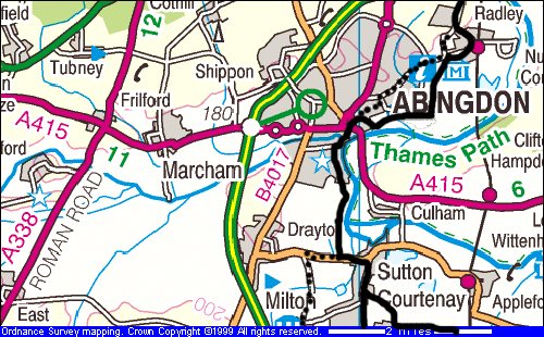 From Abingdon you can follow the National Cycle Network south towards Sutton Courtenay. This is signposted, but work is still in progress. Look out for signs with a bicycle symbol and a red "5" (Route 5 of the NCN). Starting from outside the Guildhall, the route is East St Helen St, St Helen's Wharf , LEFT onto Wilsham Rd (following the river), West Quay and past the sports ground. A tarmac track starts by the sewage works (494951) leading to the Peep-o-Day lane bridleway (starts 493947) to Drayton Road. The NCN turns left here, to Sutton Courtenay and Didcot. For Harwell, turn right towards Drayton and then left to Milton Village. |