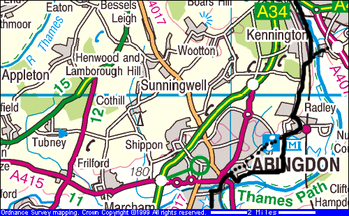 A new off-road path has been built from Radley to Abingdon, via Thrupp Lane (520987), the gravel pits (523974), the old railway line and Abbey Meadow (near 505973). For a more direct on-road route go to Abingdon via Radley Rd. Go past Waitrose, the traffic lights and into Abbey Close. Head for the archway by the Guildhall and then follow the National Cycle Route down St Helens St. See Abingdon to Oxford for details of the journey to Harwell. A free town cycle route map is available from Abingdon Town Council. |