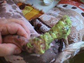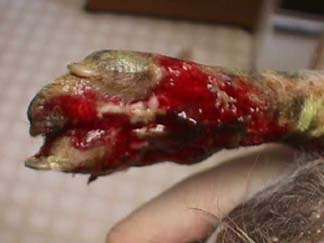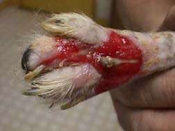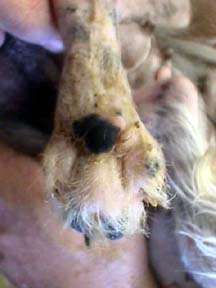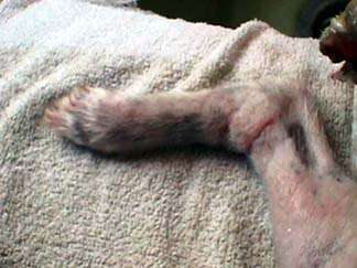 I have to believe that things are looking up, but it is hard to do. Yes, those whitish objects are Jazzy's toe bones. She has lost the nail on the second toe, and that toe was in doubt for awhile. Now, with an obvious blood supply to the toe, maybe it will make it yet!!