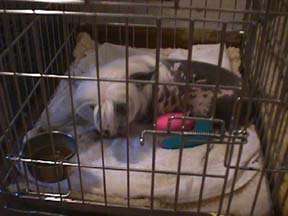 Jazzy now spends her time with Peaches as a permanent house dog and is thrilled with being out of that damn cage!! And, since she is back in her favorite "FrogDog" position I think it is a good guess that the pelvis healed OK!