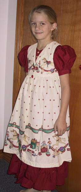 "4-03" is a "Daisy" style size 5/6 with a length of 36 inches. Dress is maroon, pinnafore is in the Daisy Kingdom Rocking Horse material. $49.95