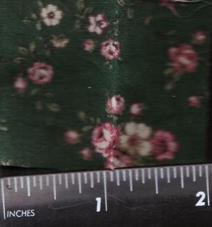 "6-09" is a Laura dress and bonnet only in light corduroy that has a black background with large fushia roses and green leaves. Size 4, length 32 inches. $44.95