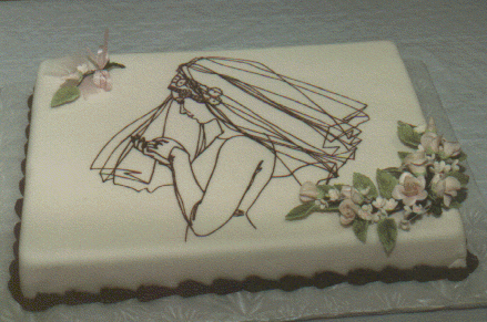 The bride cake was for a shower, it is a 9X13 sheet cake covered in rolled fondant icing. The bottom border is done with a tube 18 shell boarder. The flowers are made of gumpaste and wired together for the spray on the end.