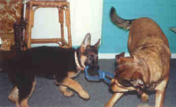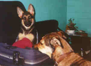 We made a big mistake when we got Rambo and Sandy only one month apart - being so close in age they'd formed their pack, Rambo in charge & Sandy right-hand girl. Sandy was prepared to accept the little 7 week pup into the family, but Rambo saw her as an intruder and tried to bite her 3 times before Trevor had to make him realize that he wasn't the boss. From there things only got better…he realized she was actually quite a lot of fun & I think he actually misses her when she goes away.