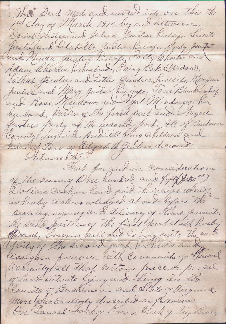 The first page of the deed passing interest in Betty's 140 acres to her oldest son, Daniel Justus (author's collection - thanks to Tuck and Aileen Baker).