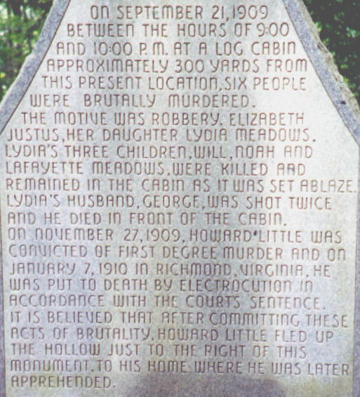 The trial began on November 18, 1909, and was finished three days later. After testimony was heard from his wife and the evidence was presented, the jury came back with a "guilty" verdict. Howard Little was convicted of the murders on Laurel Creek and sentenced to death. He was electrocuted in Richmond on January 7, 1910.