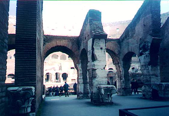 鬥獸場與對面的古羅馬廣場相望,在上頁第二張圖片中我們便可看見鬥獸場與古廣場。鬥獸場是於約公元72年由維斯佩基安皇帝(Vespasian)下令開始建造,在古廣場中有一個白色的堤多門,它與鬥獸場是同時期興建的。公元70年Vespasian的兒子堤多(Titus)攻陷了耶路撒冷、毀了希律聖殿,他俘虜了10萬的猶太戰俘來到羅馬,公元76年他用10萬戰俘建造了堤多門和鬥獸場,這兩個建築物一直是以色列人亡國的象徵,堤多門又被稱做以色列亡國紀念門。在羅馬共有四座競技場,它們提供戰士格鬥及野獸博鬥的場地,讓民眾和王族們觀賞使用,後來更成為基督徒被凌遲的場地。