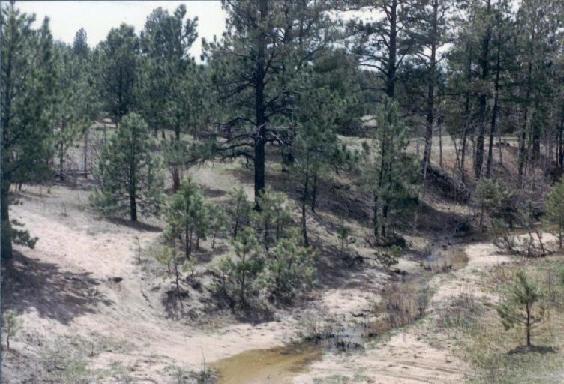 "From Jim's Camp the distance is twelve miles to 'Brush Corral' or the entrance to the 'Pinery.' The corral will be easily found. It was built by Col. Loring of the United States army, who led a detachment destined for Utah over the route in May, 1858. The next cammping place is O'Falley's Grave, twelve miles distant, the whole way being through the pinery, and marked by the various camping places of Colonel Loring - broken wagons and dead animals, all of which attest the difficulties of his march. O'Falley's grave is in an amphitheater of hills and rocks - a peaceful valley, watered by a beautiful stream. O'Falley was one of the vicims of Col. Loring's march."(4)
