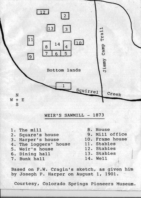 Some dozen miles to the south of Fagan's grave - at the trail crossing of Black Squirrel Creek - a sawmill was constructed in the early 1860's. Jerome Weir was employed there in 1863; he became owner the following year. His was only one of several sawmills that ringed the pinery. These sawmills supplied lumber to Colorado City and Fountain. In the early 1870's General William Palmer began advertising for the supply of ties to the Kansas Pacific Railroad then building west out of Kansas. It was said that the pinery provided nearly a half million ties at one dollar each.