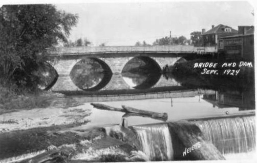 These are where the first pictures were taken around 11:00 a.m. on June 15, 1925. The rock bridge is just north of the dam. Kingsley's mill is on the east side of the river, beginning just south of the highway to a point downstream of the dam. Above the bridge is open farmland except for on the near east side of the river where the city power house is located. Immediately north of the rock bridge on the west side of the river is the town hall. Immediately to the south of the rock bridge on the west side is Huntington's wagon shop. Just down stream is the city park with a pavillion.