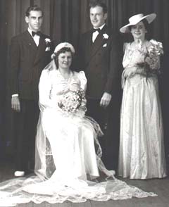 My Mom and Dad were married in July,1941 in Hillsboro, NH. They first set up "housekeeping" in Portsmouth, NH, in a little trailer near the Naval shipyards there. The best man in the picture is my Uncle Bob, Dad's youngest brother and the maid of honor, in the fashionable hat, is my Aunt Mary, Mom's only sister - we have always called her Mamie. Colored pictures were not yet the photos of choice - if so you could see that both Mom and Dad were red heads. At the time of my Dad's death, they had been married just a few days shy of 47 years.