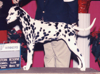 Ch. K-Max Absolutely Fabulous (Ch. Whiz x Ch. K-Max Riot Girl) Abby finished her title on October 18, 1998. She received both majors from the puppy classes. She was also part of a Best Brace in Show, teamed up with her grandfather, Ch. K-Max Paisleys Northern Exposure. Bred, owned, and handled by Max and David Kemp of K-Max Dalmatians. Bi-Lateral hearing. |