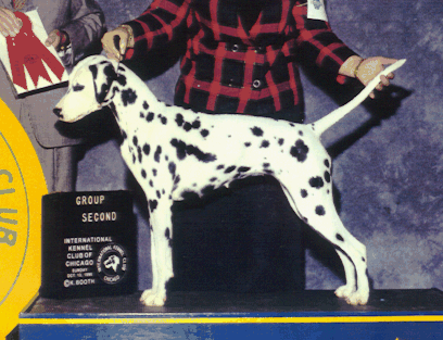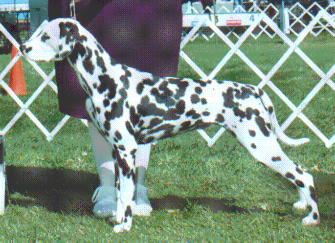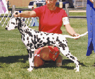 Ch. Firethorn Jax or Better (Ch. Whiz x Signature N Firethorn Finesse) Jax is an outstanding young dog, a littermate to our Buddy. This one has given us lots of thrills, including Best of Winners DCA 1998, Best of Winners Colorado Specialty 1998, Best in Specialty Chicagoland Dalmatian Club 1998, and Award of Merit DCA 1999. Bred and owned by Jodi Edmundson of Firethorn Dalmatians. Co-owned and handled by Dave Slattum of North Dalmatians. Bi-Lateral hearing. |