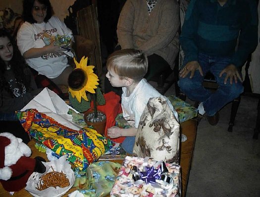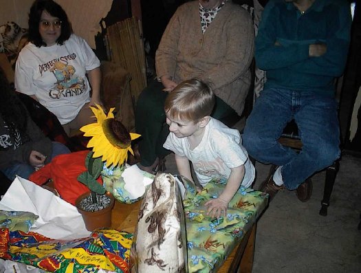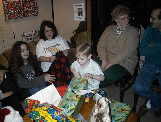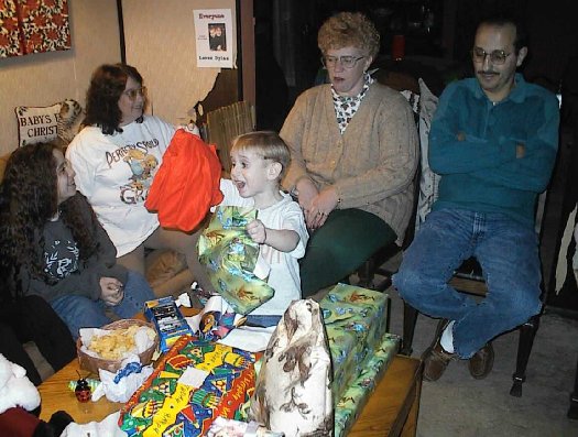 I love presents! (From left to right: Aunt Kelly, Nanny, me, Aunt Pat, and Uncle Fred.)