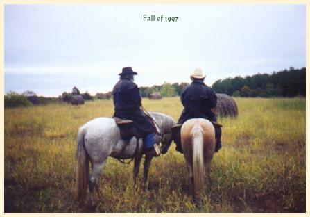 We like to do alot of riding at Land Between The Lakes. All pics here are from farious rides during the fall of 1997. This was taken off the back of "Jethro" looking out into one of the many fields there. I do believe that this was on trail #6. It had been raining and all had to put on ponchos and rain coats.