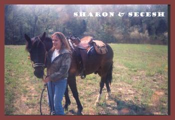 Here is my little sister, Sharon. She's 11 years younger than me, but, we don't know that. While I was growing up and we had horses, she was too little to ride. About the time we sold them she had just started to show interest, but dad I guess was tired of fooling with them. She used to save her ice cream money from school to buy a Friday evening paper to look at the horses. She'd find one fairly reasonable and show it to dad and all he'd say is "we'll see."She finally did get her a horse about 3 years ago and has come along way in her riding ability. It was two years ago she ran full speed across a field with me and she was hooked!!