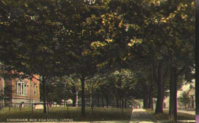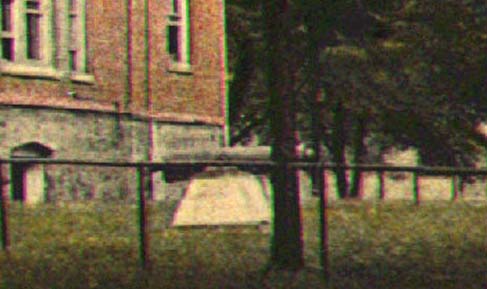 The Hill School was situated on the west side of Chester, a block south of Maple. "Baldwin House", a Senior apartment complex, is now located on the site. This particular German postcard was published by Backenstose Bookstore, Pontiac, Mich. It goes back to the 1910 era when such cards were popular. The camera looks north toward Martin St. from the Merrill St. corner. Note how many lush trees surrounded the old school building. If you look carefully in the lower left corner, you can see the Confederate Cannon from Fort Morgan which fired on Union Naval Vessels during the Battle of Mobile Bay. The next photo provides an enlarged view of the cannon.